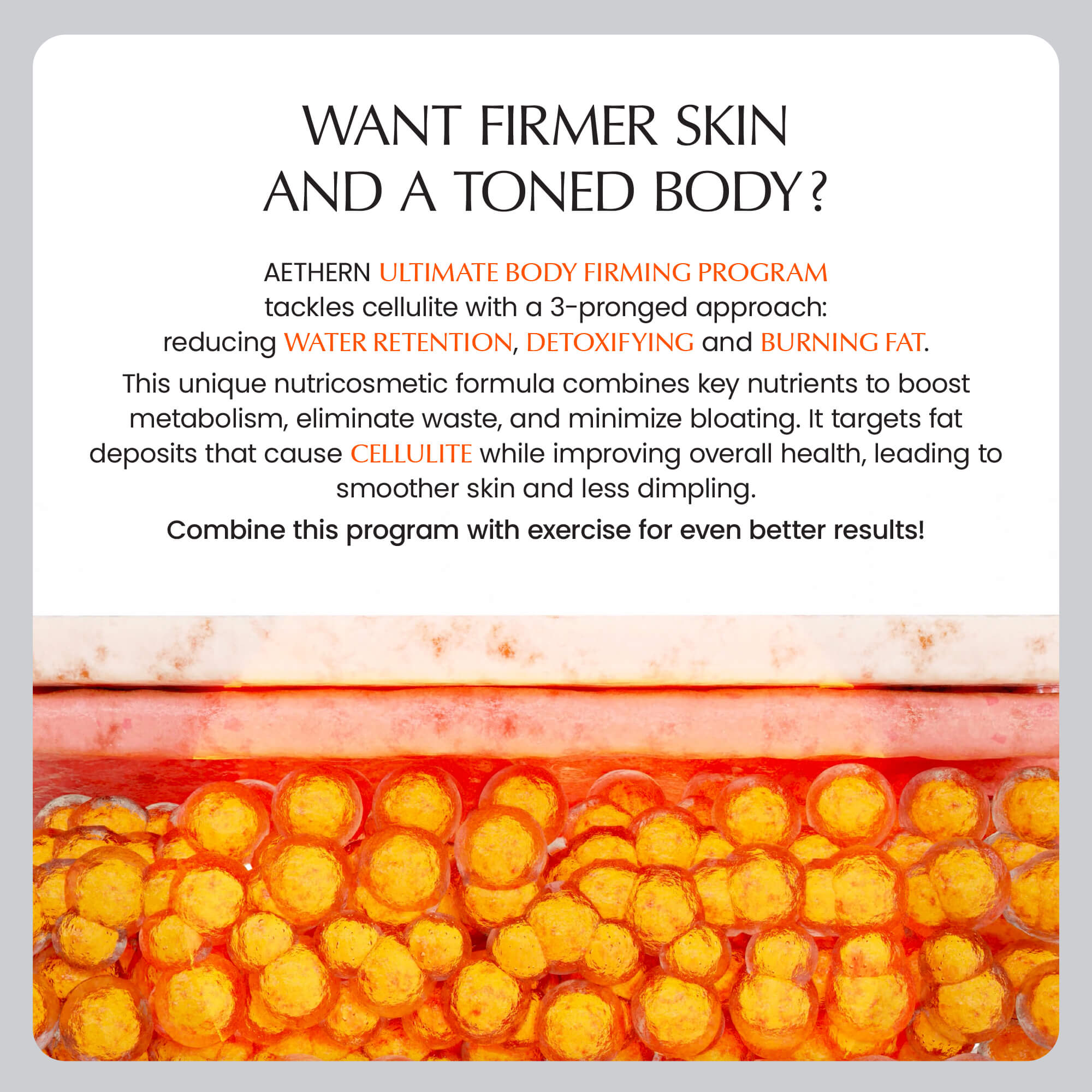 AETHERN Ultimate Body Firming Program targets cellulite at the source—reducing water retention, enhancing detoxification, and activating fat metabolism for visibly smoother, firmer, more sculpted skin.